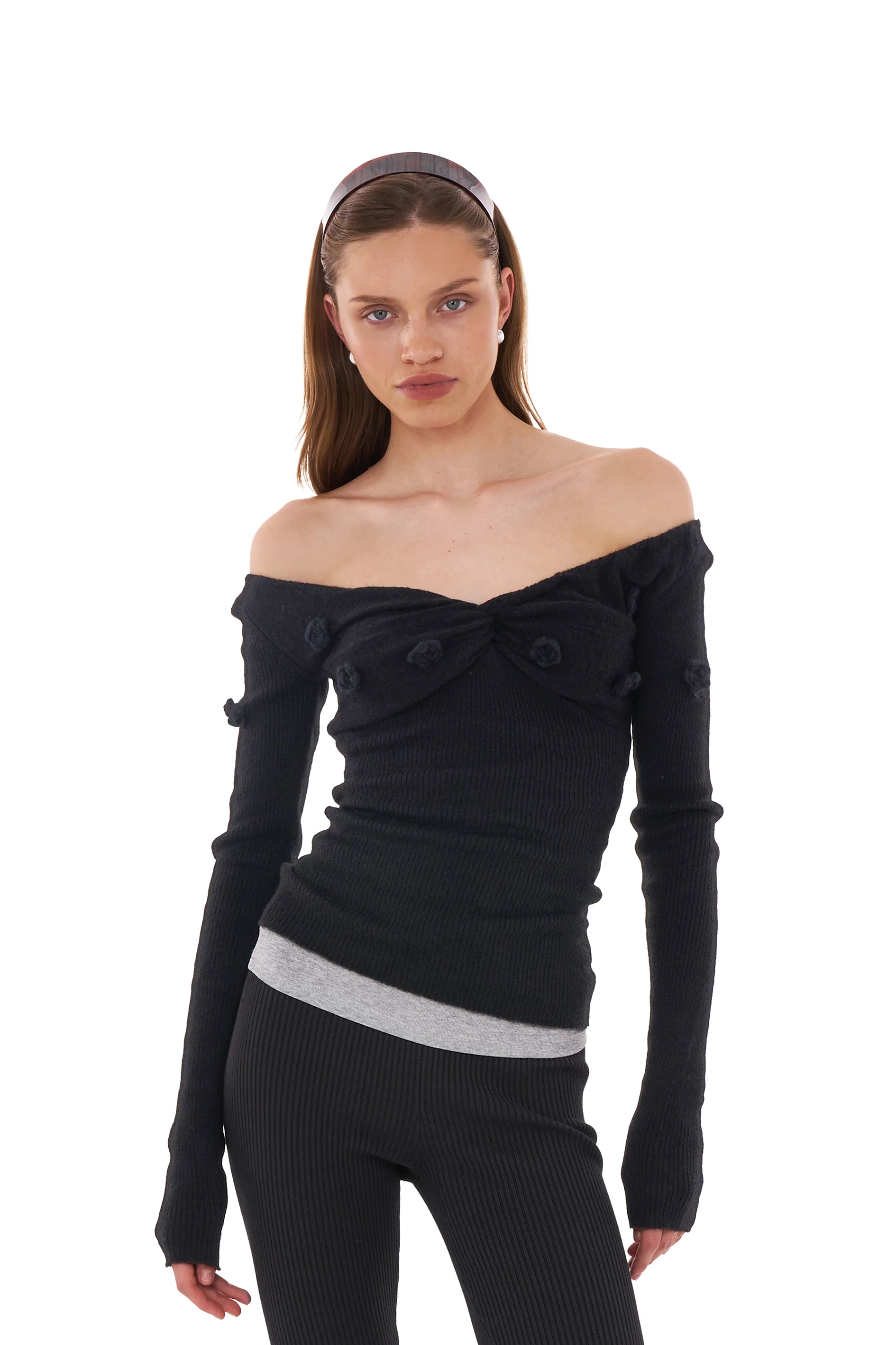 FLORAL TWIST-FRONT OFF-SHOULDER KNIT TOP