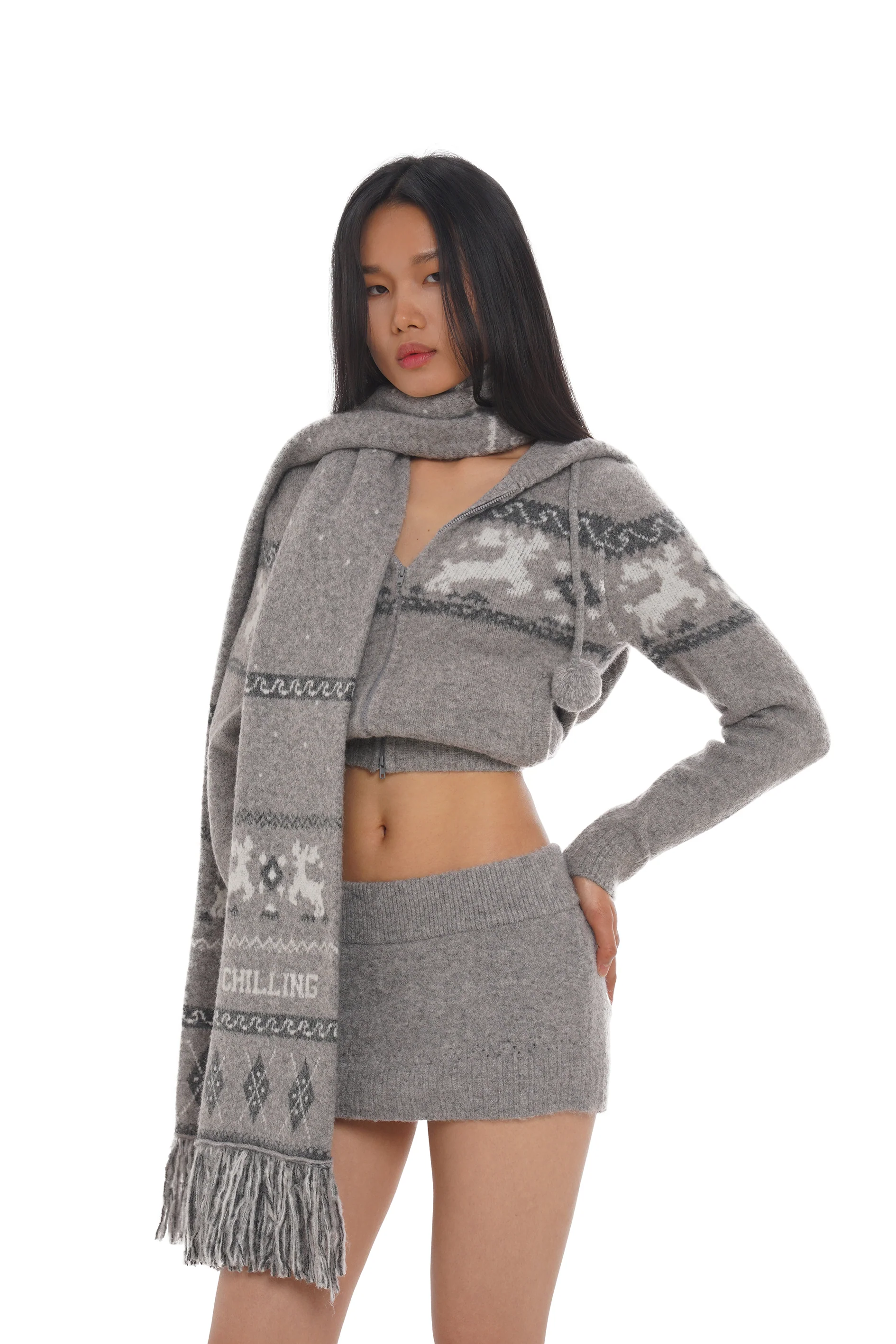 FROSTY REINDEER HOODED KNITWEAR & WOOL-BLEND MINI SKIRT & SCARF